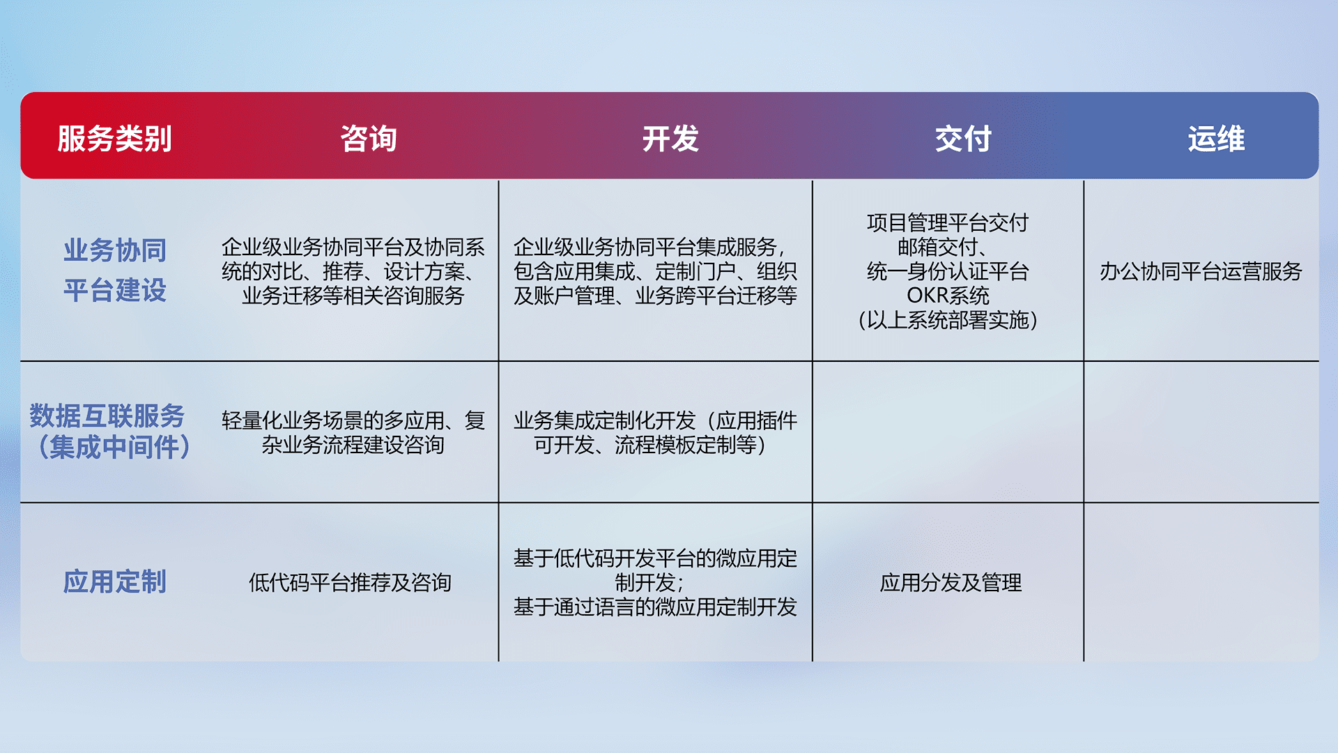 针对钉钉、、、企微、、、、IDaas等平台级产品提供产品的规划、、、方案、、、、交付、、定制化开发等服务,,,,实现如统一协同办公、、、智能客户服务、、混合会议管理、、、智能数据查询、、、等业务场景,,,,实现数字化转型。。。。