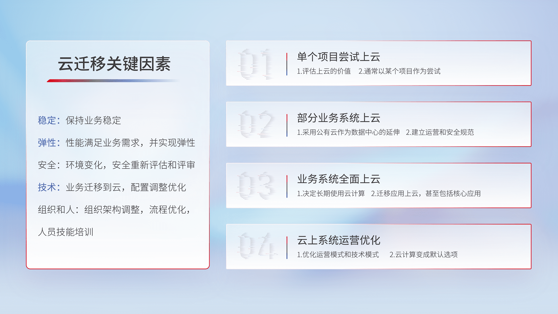 结合实际业务,,从规划设计、、、、云平台选型、、、云原生改造、、数据迁移、、集成交付,,,迁移全过程为客户识别最佳上云路径,,,,做好风险识别管理,,设计网络架构、、、身份权限、、安全审计合规、、、、操作审计、、、日志审计、、、监控告警策略、、、多站点容灾设计等,,对云上基础设施进行整体规划,,提升IT治理水平,,,以满足弹性、、、高可用、、高性能的需求。。。